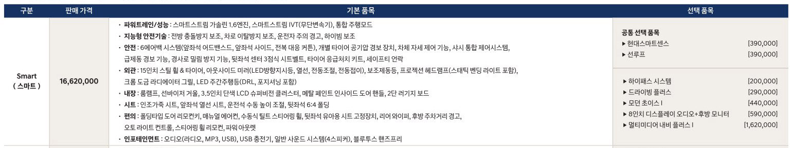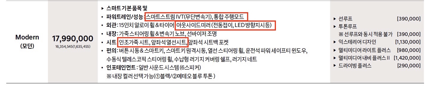 아래의 표는 이전 버전 베뉴의 모던트림 가격표이다. 여기서 빨간색 네모표시는 2021 베뉴의 스마트등급의 기본옵션이 되었다.