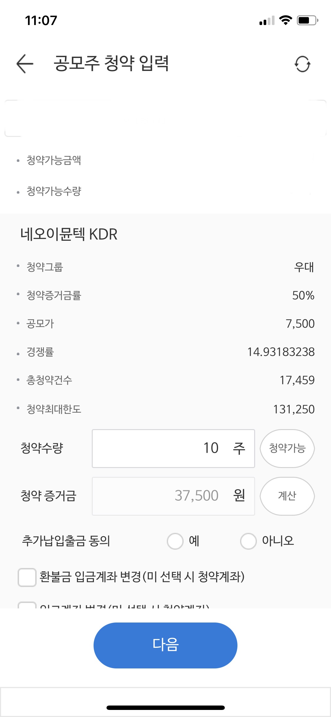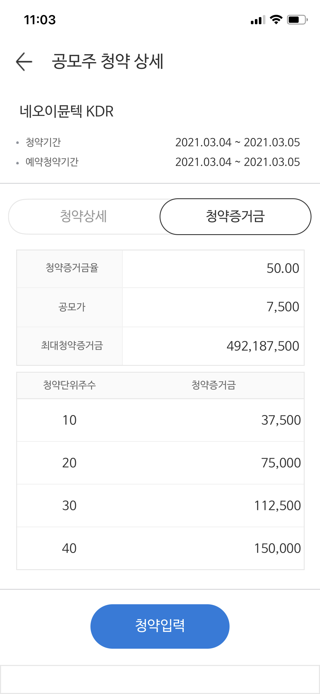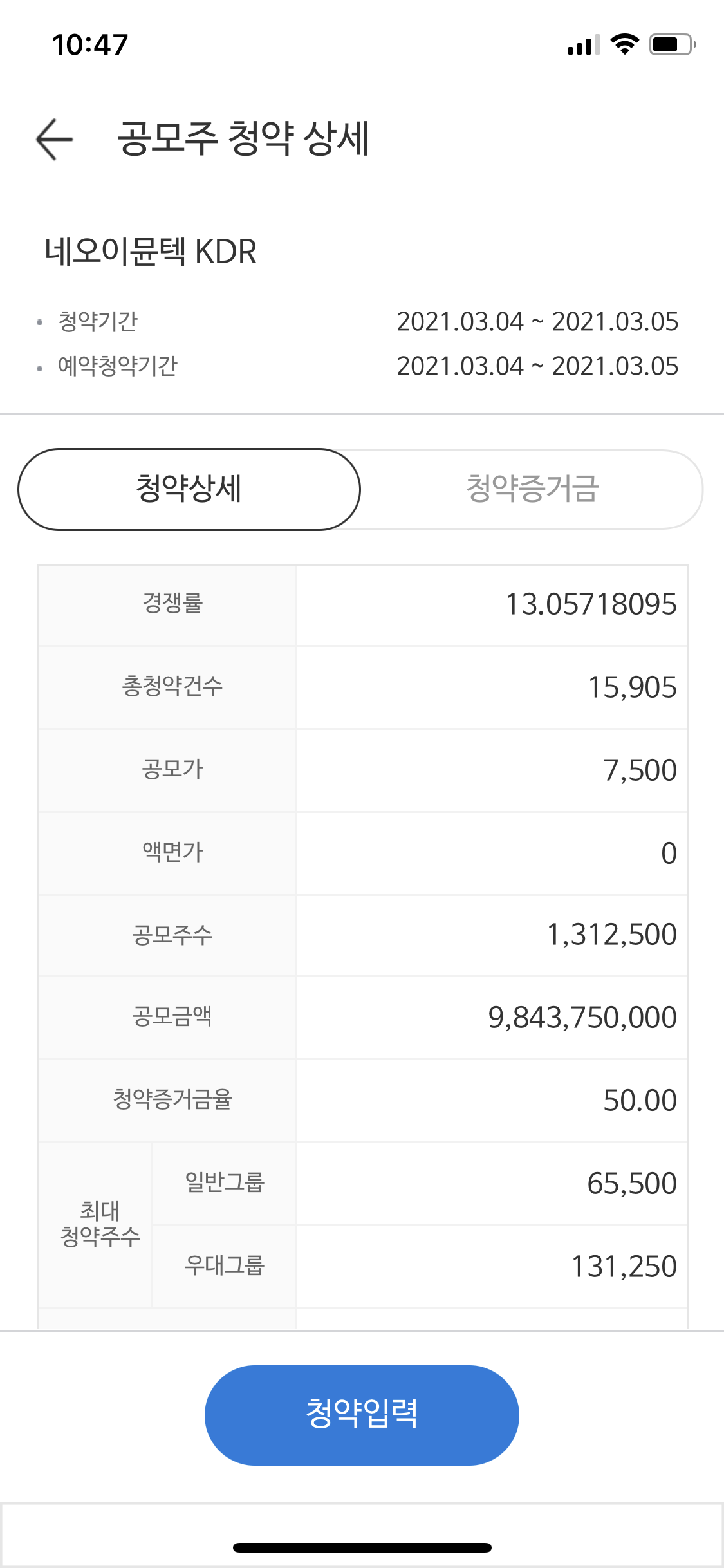 메뉴로 들어가면 아래와 같이 지금 청약가능한 메뉴가 나온다. 네오이뮨텍은 오늘 청약이기 때문에 목록에 보인다. 클릭하면 상세내용이 나온다. 상세내용에는 청약에 관한 주요 내용이 나오며 청약증거금도 확인할 수 있다. 네오이뮨텍의 경우 최소 10주 (37,500원)이다. 균등배정방식을 노리려면 10주만 청약해도 최소 수량은 받을 수 있다.