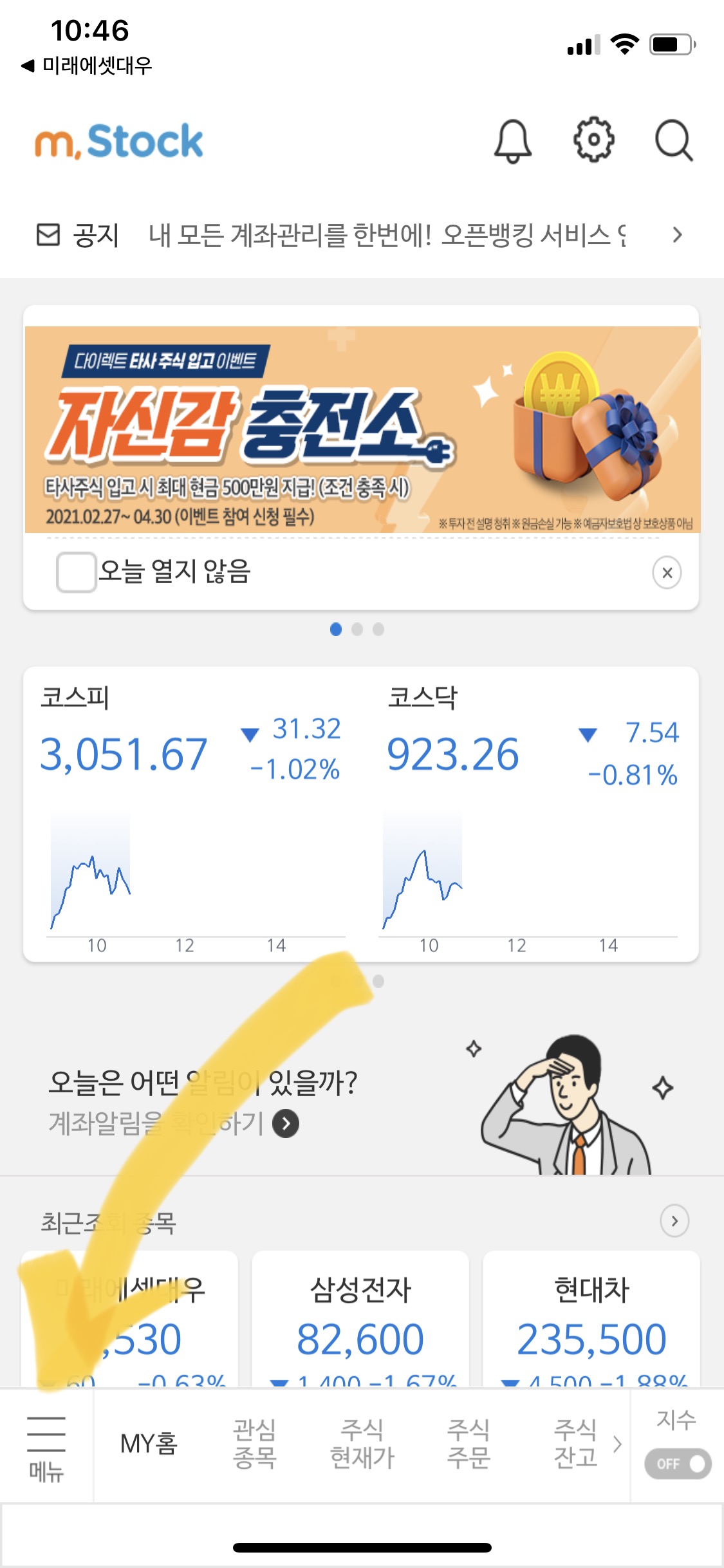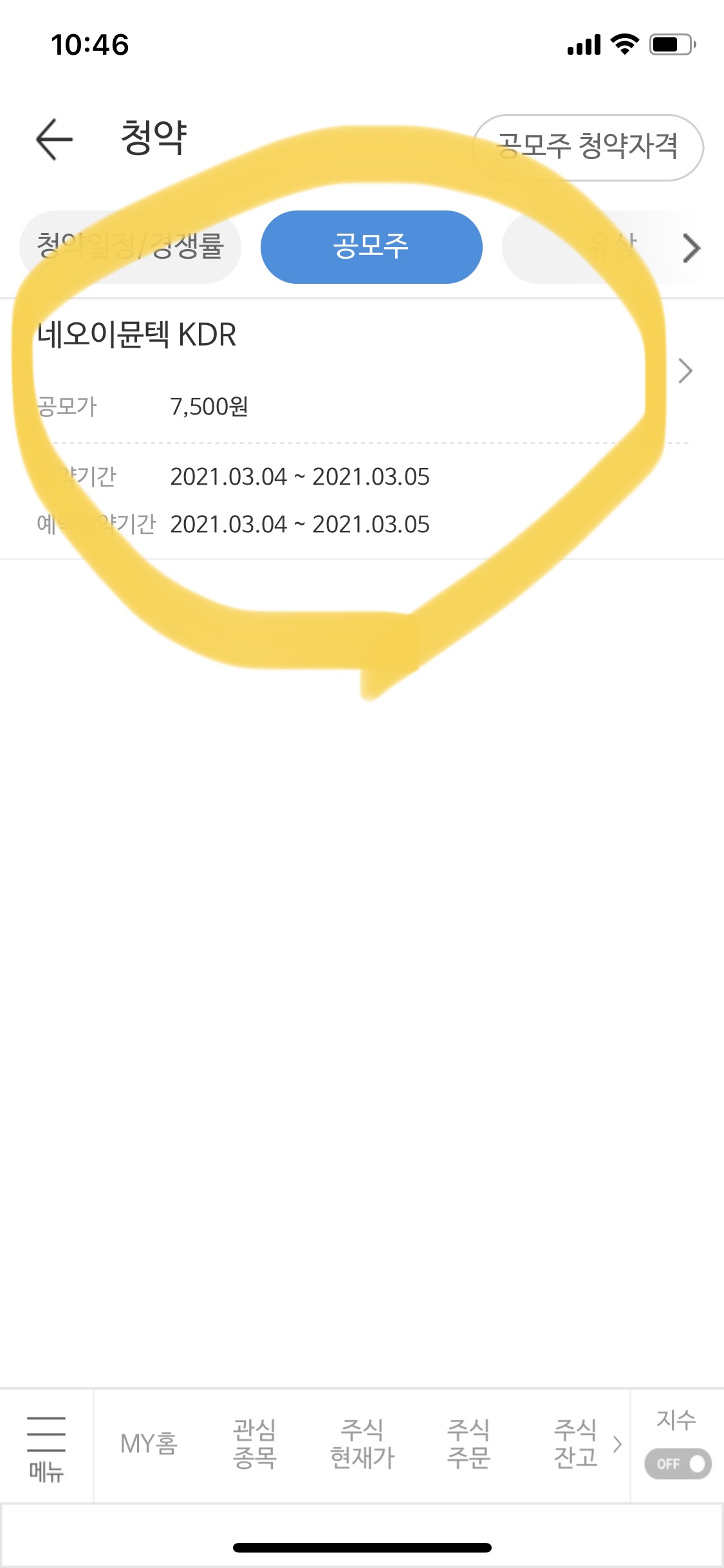 오늘은 네유이문텍 청약일이다. 마침 새로 개설해둔 미래에셋대우 계좌가 있어서 네오이뮨텍 청약을 해보기로 했다. 공모주 청약은 한번도 해본 적이 없어서 이참에 미래에셋대우의 앱인 m.stock으로 청약하는 방법을 직접 공부해봤다. 나처럼 모르는 사람들이 있을 수 있으니 캡쳐해서 정리해놨다.