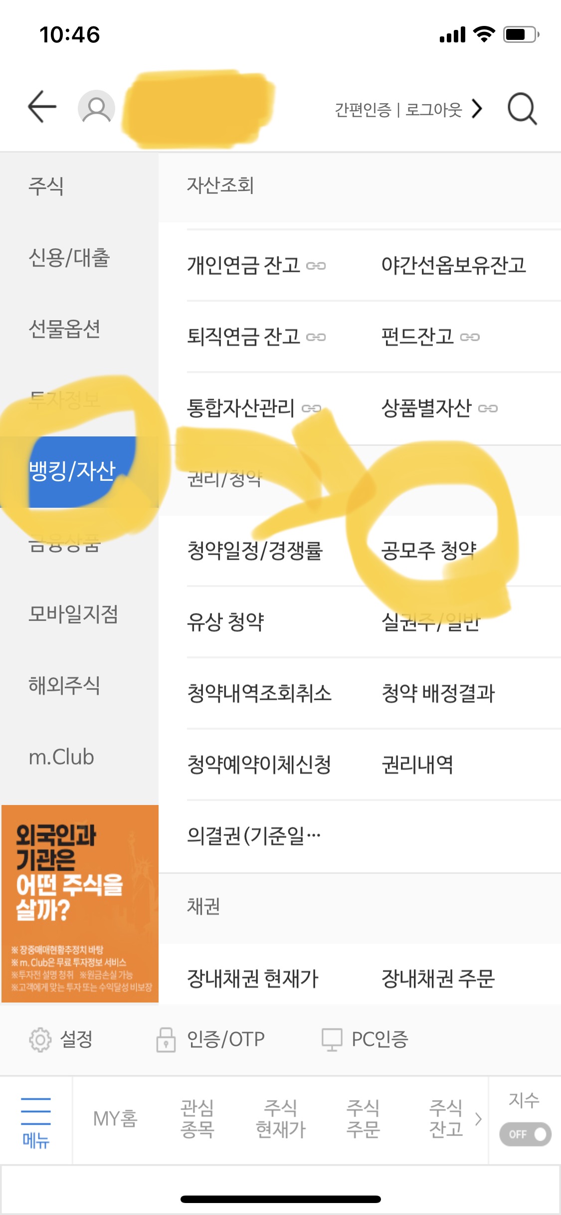 그리고나서 오른쪽의 하위메뉴들을 아래로 내리다보면 권리/청약 메뉴가 나오는데 그곳에서 공모주청약이라는 메뉴로 들어가면 된다. 아래 이미지를 참고하면 쉽게 확인 가능하다.