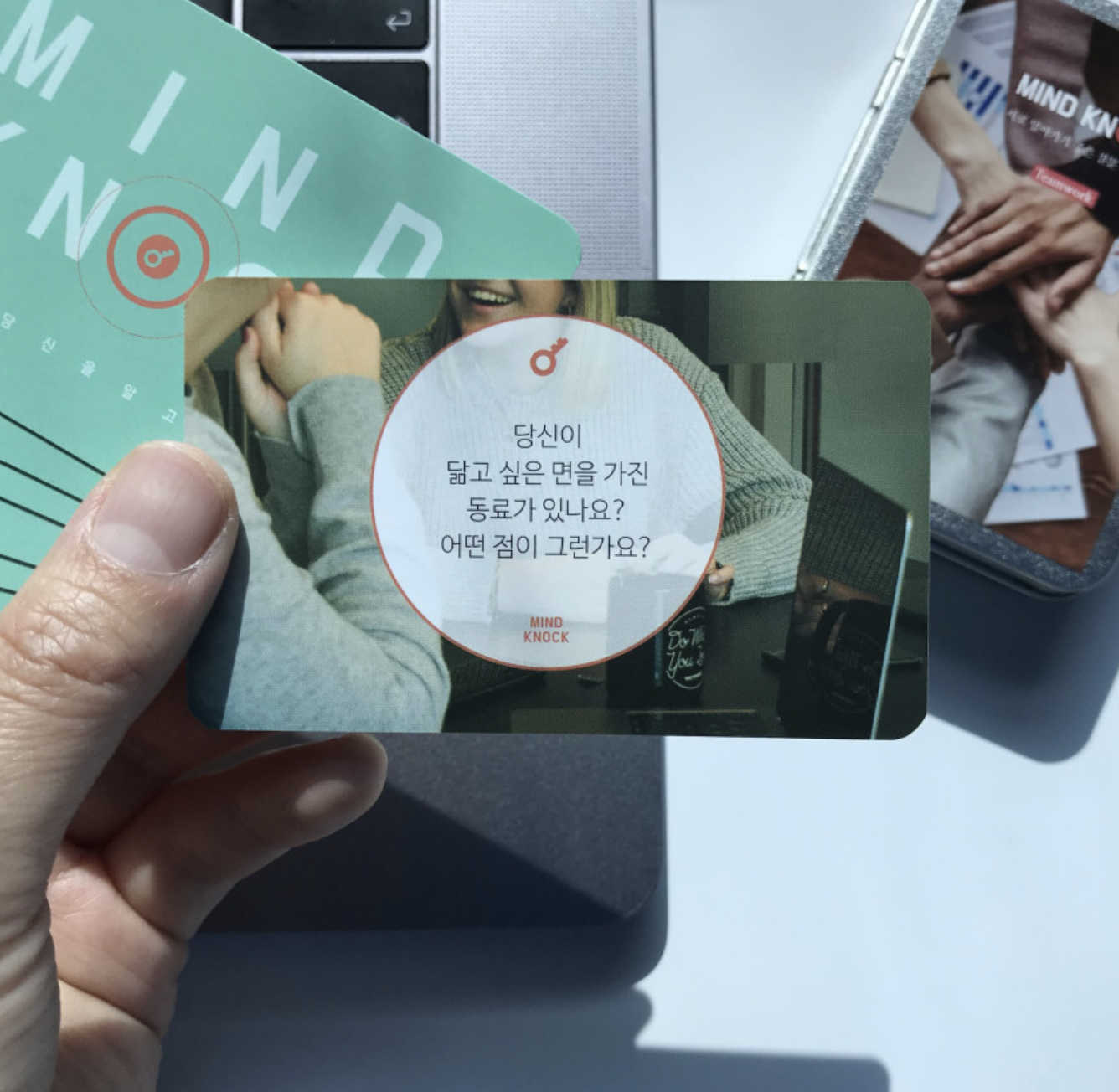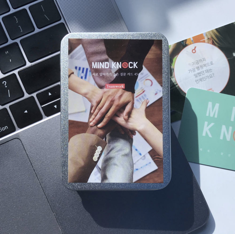 마인드노크 팀워크는 팀별로 앉아 질문카드 중에 하나를 선택한 다음 선택된 질문의 답을 각자 말하는 방식이다.