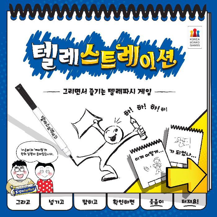 텔레스트레이션은 그림을 그리는 게임이다. TV프로그램에서 많이 봤던 '몸으로 말해요'의 그림 버전이라고 생각하면 쉽다. 각자 스케치북을 하나씩 받고 주제어를 받으면 그 주제어를 그린다. 다 그리고나면 다음 사람에게 넘기는데, 다음 사람은 그 그림을 보고 이것이 무엇인지 정답을 스케치북 다음장에 쓴다. 그리고 그 다음 사람에게 넘긴다. 받은 사람은 전 사람이 적어 둔 답을 보고 그림을 그린다. 그리고 넘기고, 답을 쓰고 넘기고, 이런 방식으로 끝까지 진행을 해 처음 제시어와 제일 마지막에 쓴 사람의 답이 일치하면 점수를 얻는 게임이다. 사실 이 게임에서는 점수가 중요하지 않다. 이 게임의 핵심은 처음 제시된 주제어가 어떻게 진화(?)해서 마지막에 쓴 단어가 되었는가 함께 이야기하는 것이다. 참가자들이 그린 그림을 보고 함께 웃고 즐기는 것이 이 게임의 핵심이다. 왁자지껄한 분위기를 연출하고 싶다면 텔레스트레이션만한 게임이 또 없다.