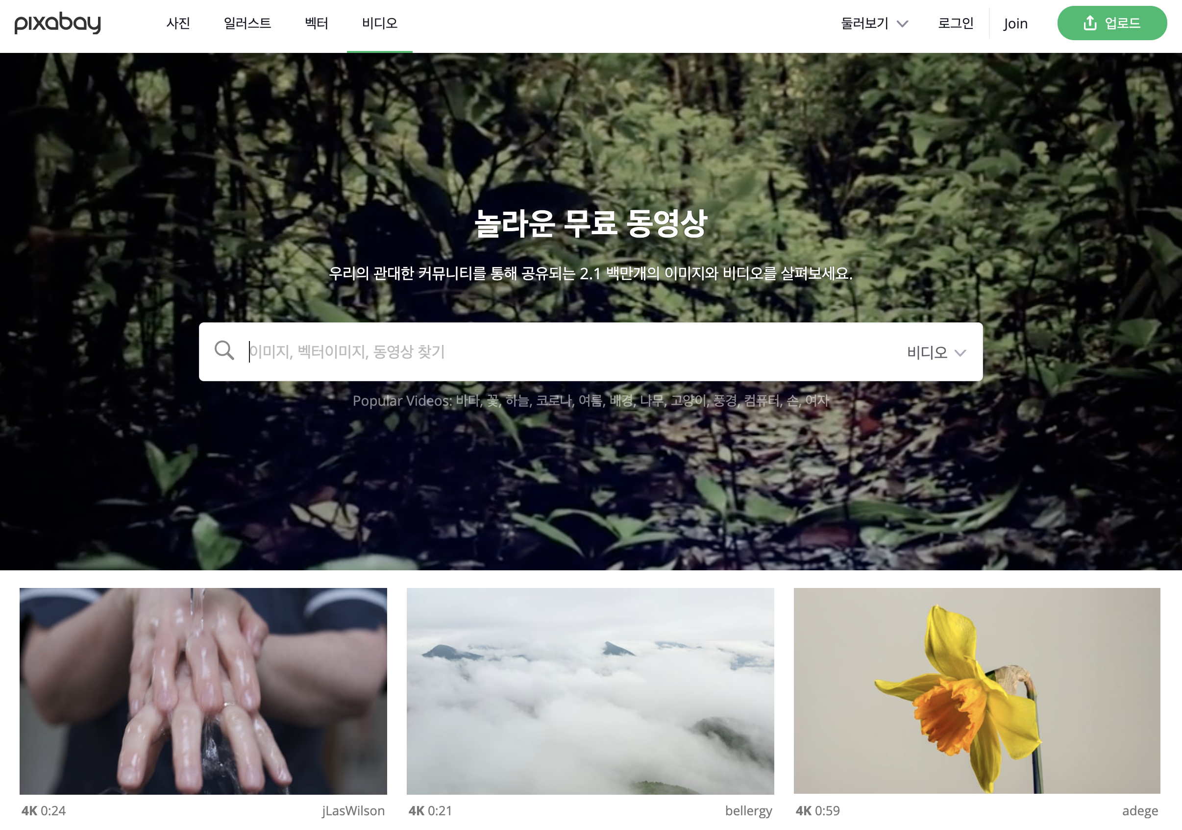 무료로 영상 소스를 받을 수 있는 사이트다. 개인적 용도 및 상업적 용도로 사용할 수 있다. 영문으로 검색해야 하지만 모든 파일을 회원 가입 없이 무료로 다운받을 수 있어서 유용한 편이다. 동물, 건물, 음식, 사람 등 다양한 카테고리에 맞춰 영상을 나눠놓았기 때문에 카테고리에서 먼저 필요한 영상이 있는지 훑어보고 그래도 없으면 검색을 통해서 원하는 영상을 찾으면 된다.