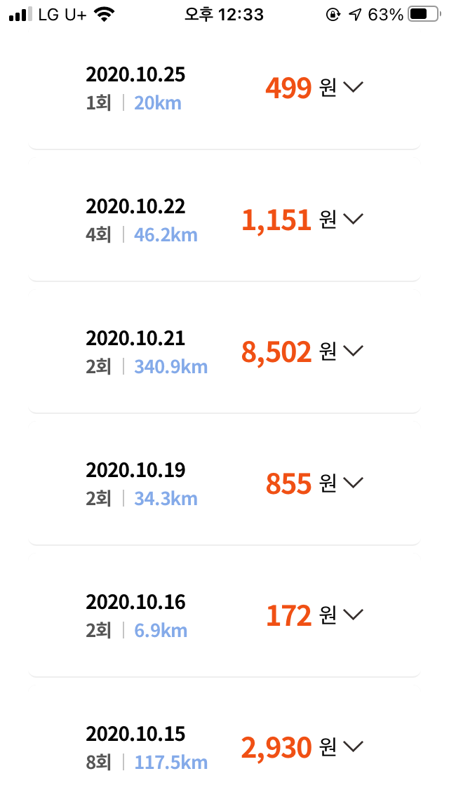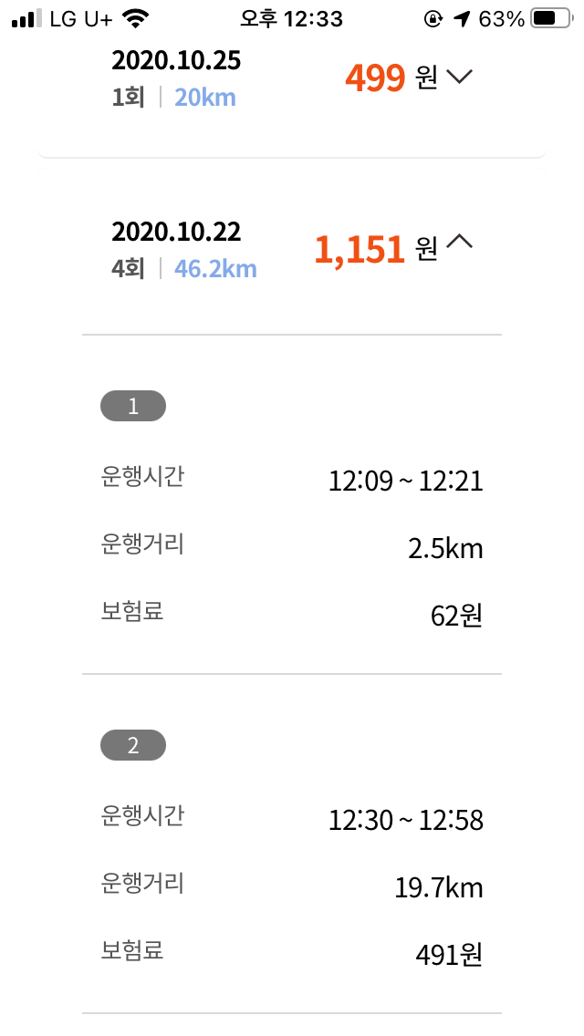 장점은 말 그대로 타는 만큼 낸다는 것이다. 몫돈이 한번에 나갈 이유도 없고, 월마다 탄 만큼 결제가 되어서 합리적인 '느낌'을 받는다. 실제로 내가 운행한 결과를 캐롯손해보험 앱에서 실시간으로 확인이 가능하다. 언제 몇시부터 몇시까지 몇키로를 탔는지 상세하게 나오기 때문에 흡사 차계부를 자동으로 적어주는 듯한 기능도 하고, 실시간으로 결제예정 보험료까지 보여주니 이점이 가장 편리하다.